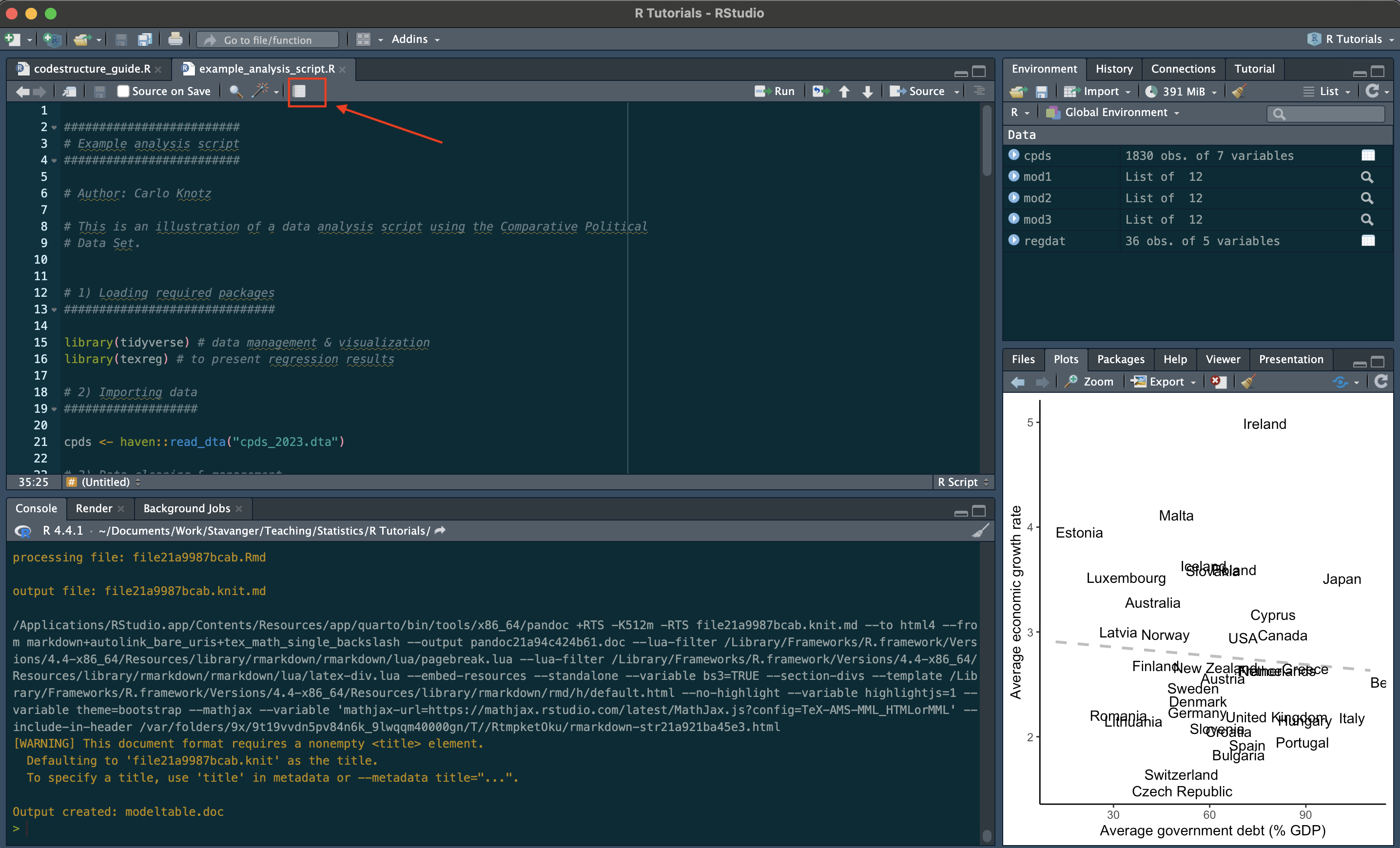 - Run the code (e.g., by clicking on Run in the menu bar at the top right of your scriptfile)
