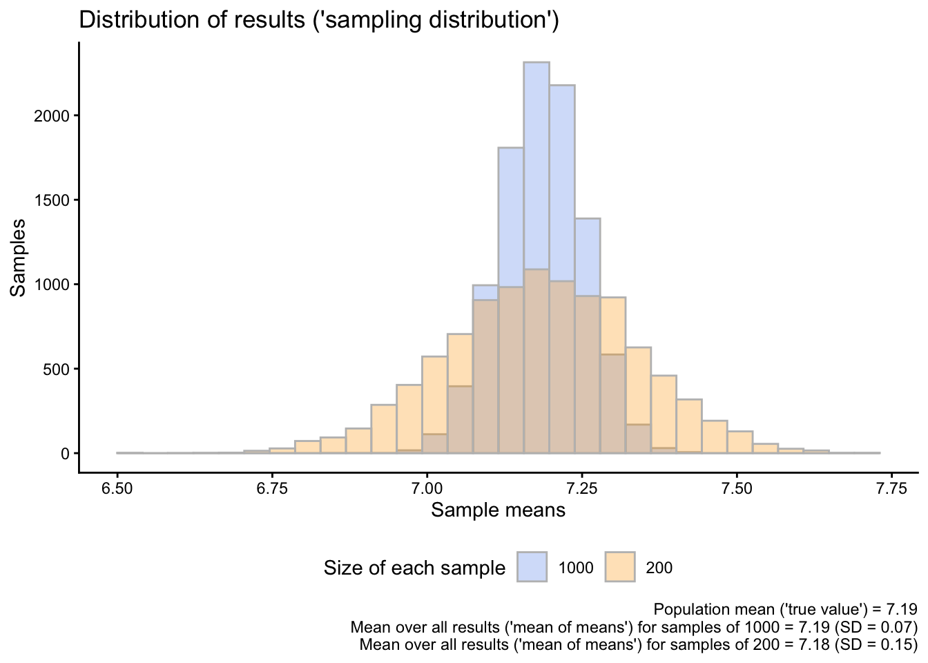 sampdist_SD <-sd(sampdist$result)sampdist_200_SD <-sd(sampdist_200$result)sampdist |>left_join(sampdist_200, by ="sample",suffix =c("1000","200")) |>pivot_longer(cols =-1,names_to ="size",values_to ="meanval") |>mutate(size =gsub("result","",size)) |>ggplot(aes(x = meanval,fill = size)) +geom_histogram(alpha=0.3, position="identity", color ="grey") +scale_fill_manual(values =c("cornflowerblue","orange")) +labs(x ="Sample means", y ="Samples",fill ="Size of each sample",title ="Distribution of results ('sampling distribution')",caption =paste0("Population mean ('true value') = ",round(popmean, digits =2),"\n Mean over all results ('mean of means') for samples of 1000 = ",round(sampdistmean, digits =2)," (SD = ",round(sampdist_SD, digits =2),")","\n Mean over all results ('mean of means') for samples of 200 = ",round(sampdist_200mean, digits =2)," (SD = ",round(sampdist_200_SD, digits =2),")")) +theme(legend.position ="bottom")