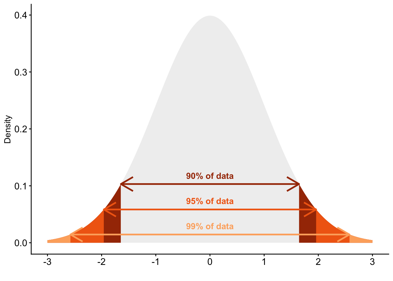 90% of all observations fall within a range of \(+1.645 \times SD\) and \(-1.645 \times SD\) around the mean