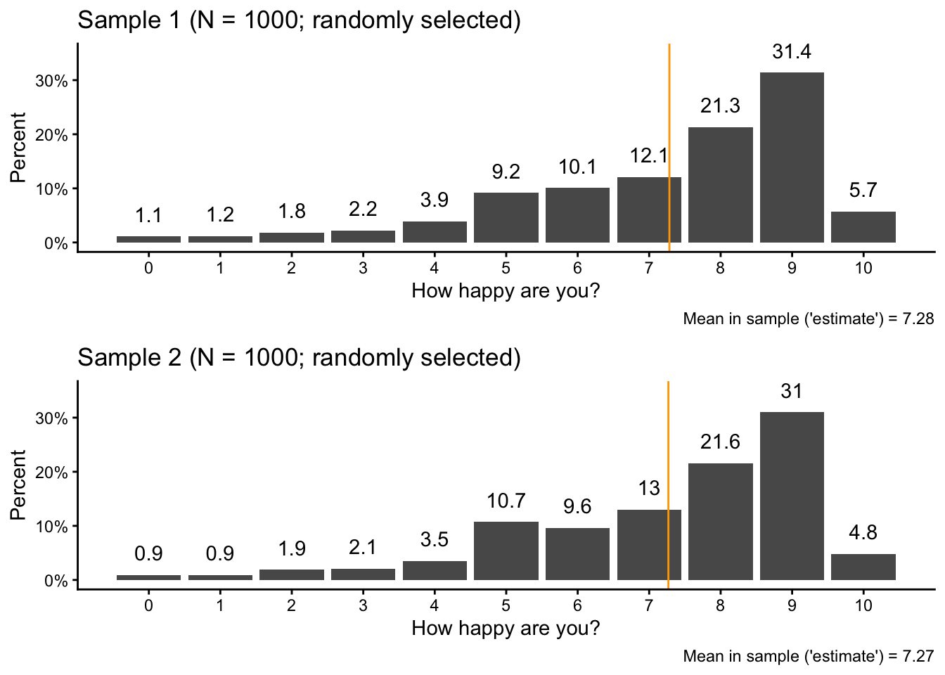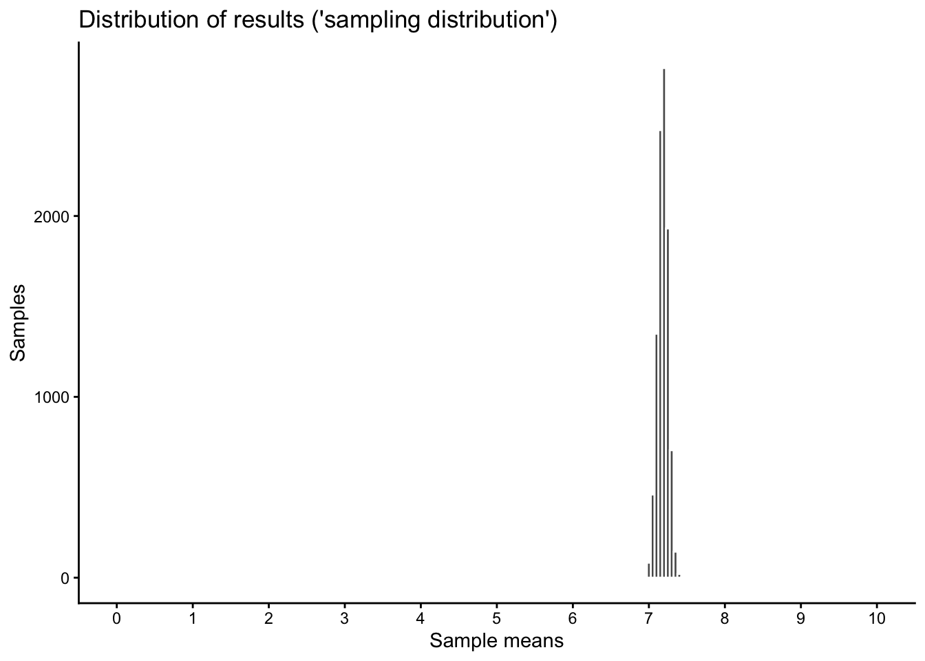 You might now get the impression that there is quite a bit of variation between the different samples, that the result “jumps” quite a bit between different repetitions of our fictional survey. However, notice also that the scale of the above graph only covers a small part of the entire scale of our original happiness variable, which goes from 0 to 10.