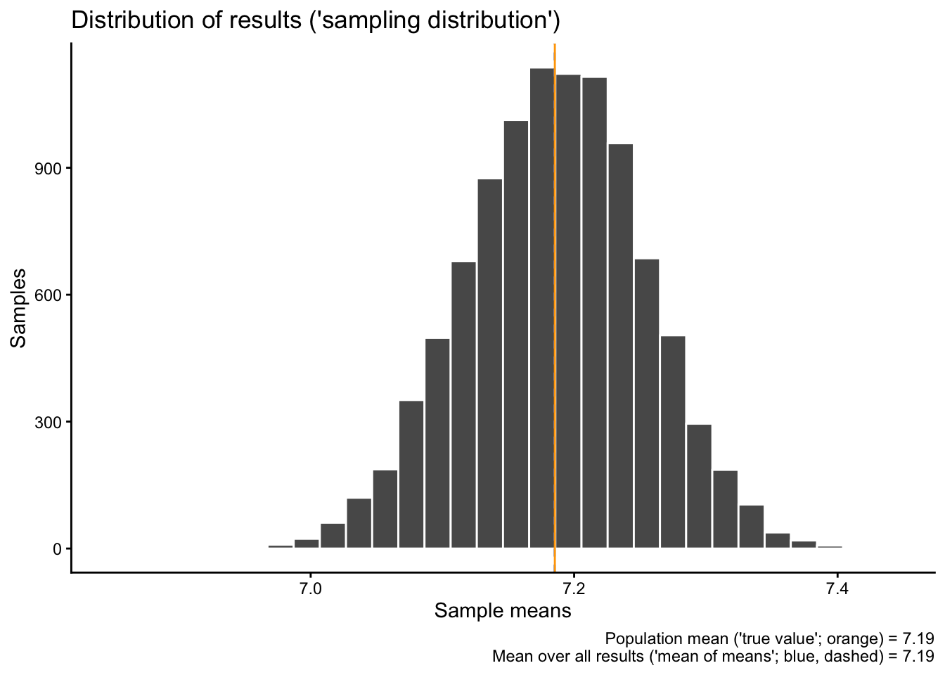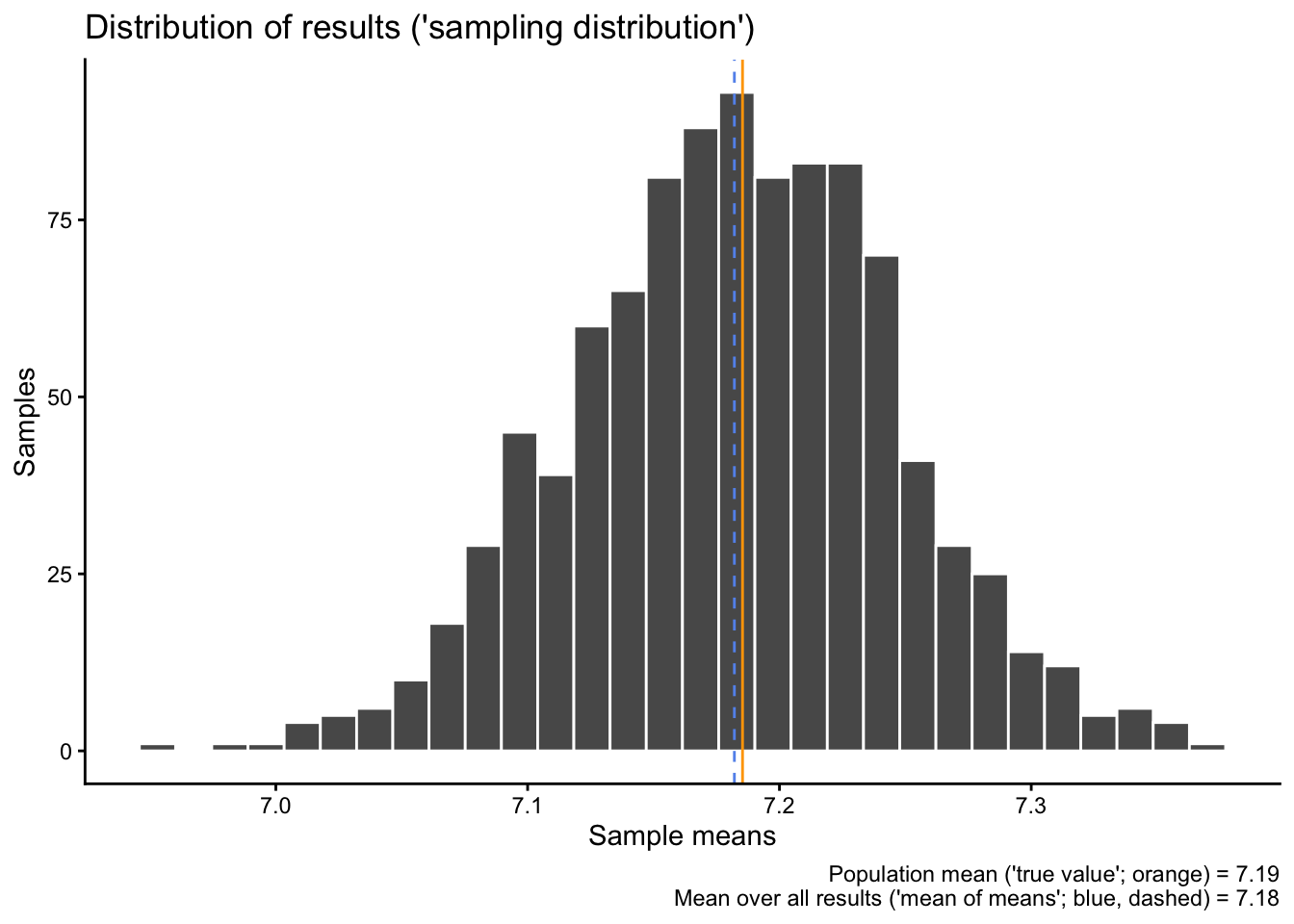 sampdist |>ggplot(aes(x = result)) +geom_histogram(color ="white") +geom_vline(xintercept = sampdistmean, color ="cornflowerblue", linetype ="dashed") +geom_vline(xintercept = popmean, color ="orange") +labs(x ="Sample means", y ="Samples",title ="Distribution of results ('sampling distribution')",caption =paste0("Population mean ('true value'; orange) = ",round(popmean, digits =2),"\n Mean over all results ('mean of means'; blue, dashed) = ",round(sampdistmean, digits =2)))
