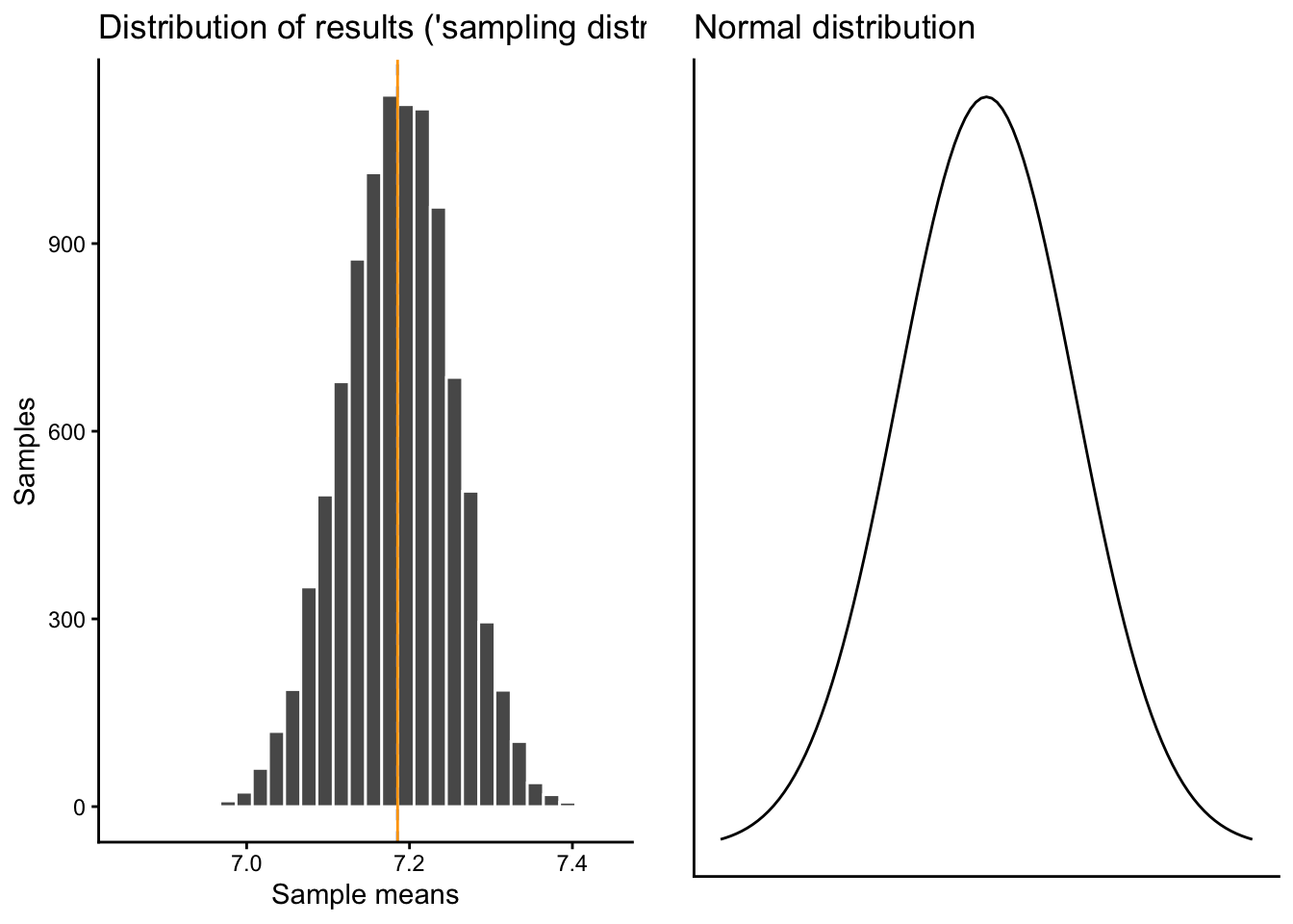 You might (should) have already noticed what how our different “survey” results are distributed, but just to make sure: Here is a comparison of our sampling distribution to the normal distribution: