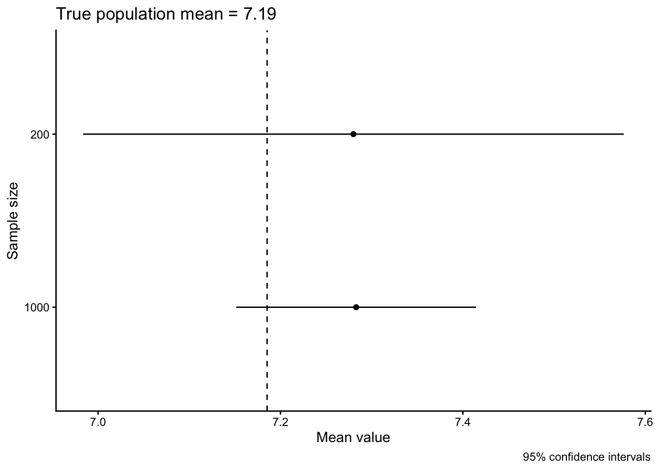 data.frame(sample =c("1000","200"),means =c(sam1mean,sam200_mean),lower =c(lower_1000,lower_200),upper =c(upper_1000,upper_200)) |>ggplot(aes(x = means, xmin = lower, xmax = upper, y = sample)) +geom_point() +geom_linerange() +geom_vline(xintercept = popmean, linetype ="dashed") +labs(x ="Mean value", y ="Sample size",caption ="95% confidence intervals",title =paste0("True population mean = ",round(popmean, digits =2)))