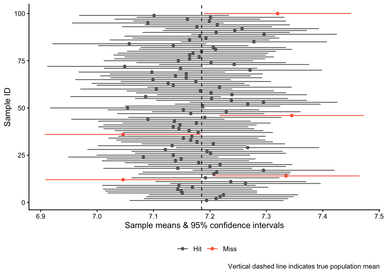 You see that in 95 out of the 100 “studies” we did, the 95% confidence interval “hit” the mark and overlaps with the true population mean. In five cases, however, we were unlucky and “missed”: The confidence intervals do not overlap with the true population mean.