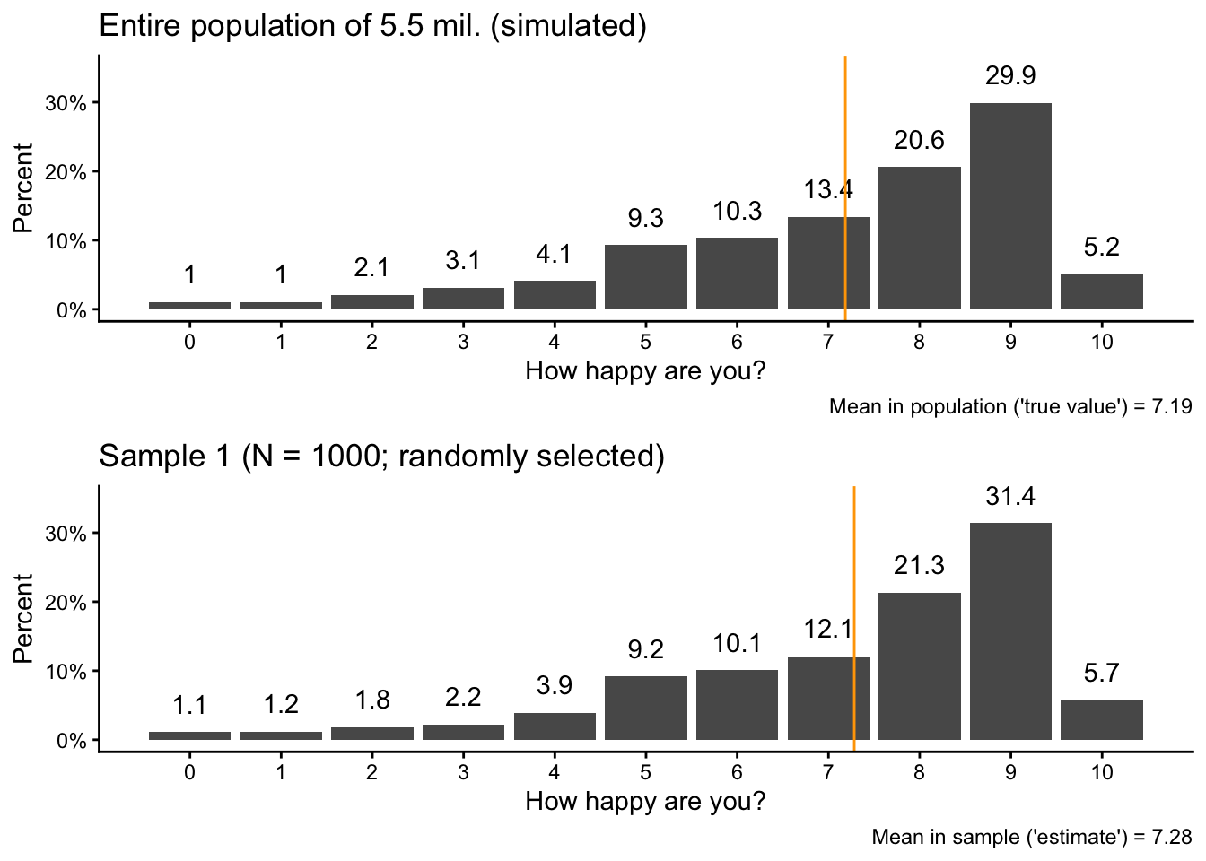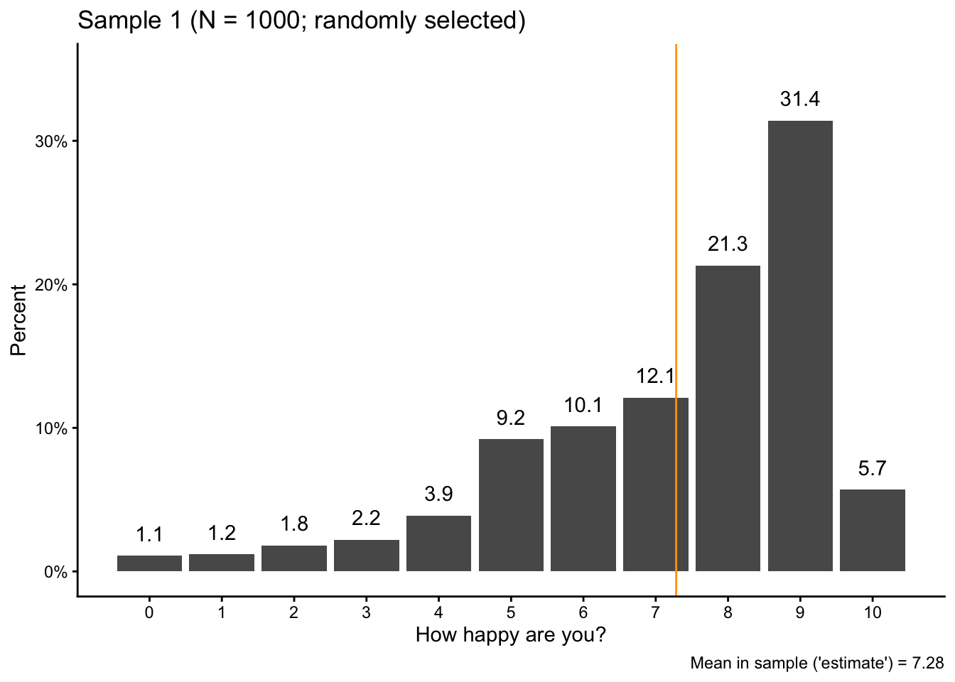 pop |>group_by(happy) |>summarize(obs =n()) |>mutate(share = obs/sum(obs)) |>ggplot(aes(x = happy, y = share)) +geom_bar(stat ="identity") +geom_text(aes(label =round(100*share, digits =1)), vjust =-1) +geom_vline(xintercept = popmean, color ="orange") +scale_x_continuous(breaks =seq(0,10,1)) +scale_y_continuous(labels = scales::percent,limits =c(0,.35)) +labs(y ="Percent", x ="How happy are you?",title ="Entire population of 5.5 mil. (simulated)",caption =paste0("Mean in population ('true value') = ",round(popmean, digits =2))) -> popvispopvis