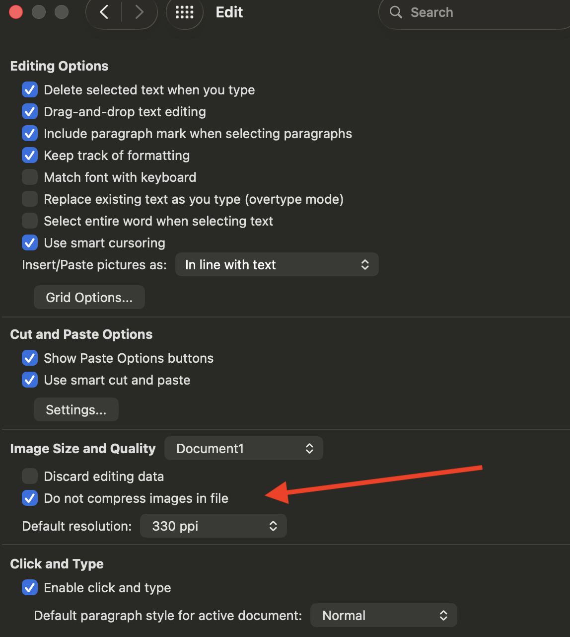 Therefore, if you use Microsoft Word, go into the settings for Word and check the box that says “Do not compress images in file” (see also the screenshot below).2 Ideally, set the default image resolution to 330 ppi and apply this to all documents.