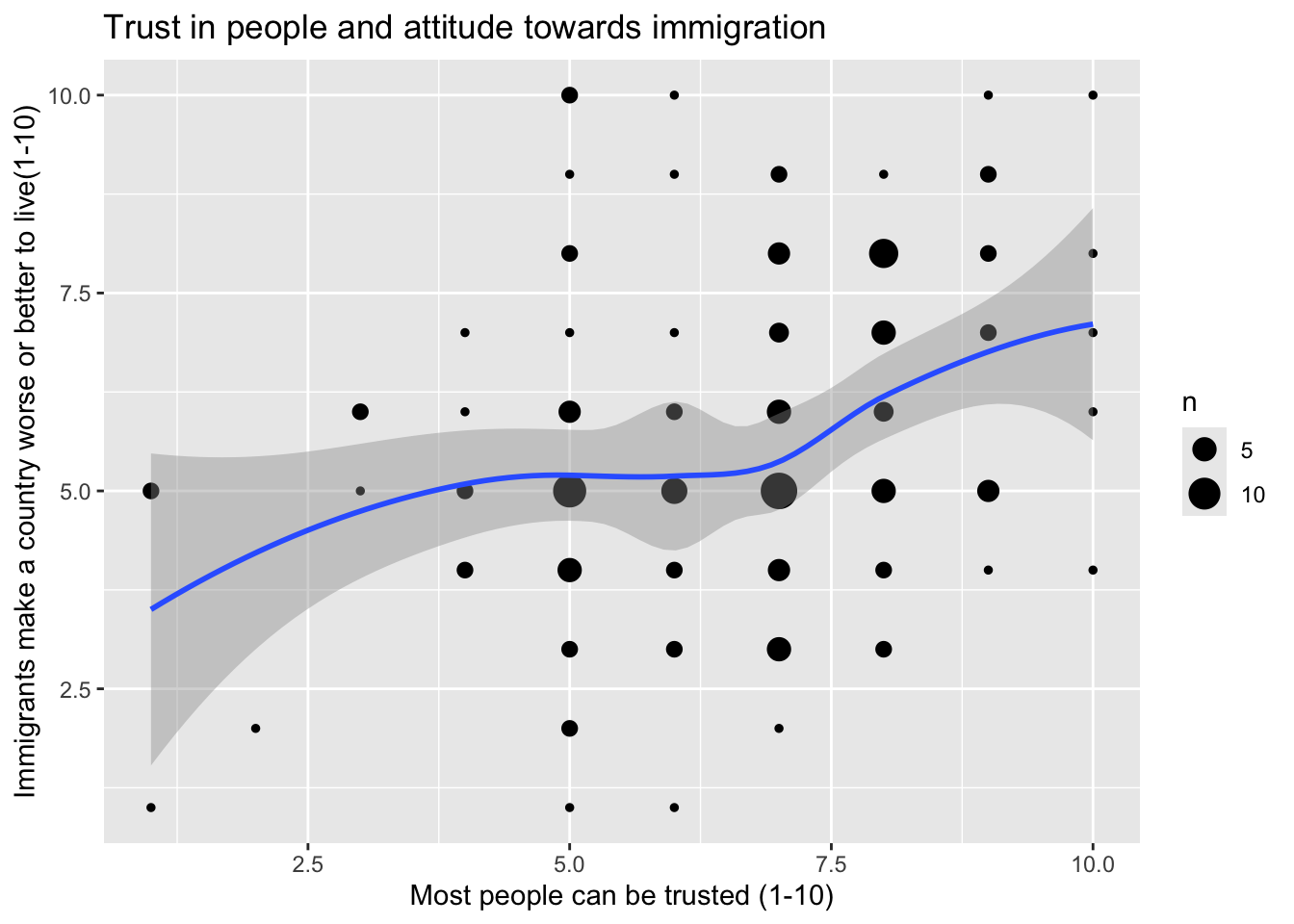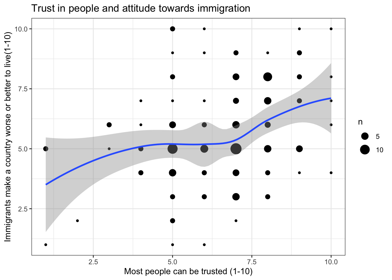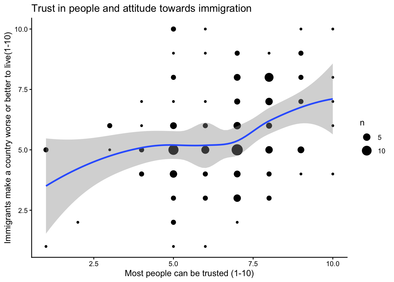 ggplot(data = ess,aes(x = ppltrst,y = imwbcnt)) +geom_count()+geom_smooth(method = loess) +labs(x ="Most people can be trusted (1-10)",y ="Immigrants make a country worse or better to live(1-10)",Title ="Trust in people and attitude towards immigration") +theme_bw()