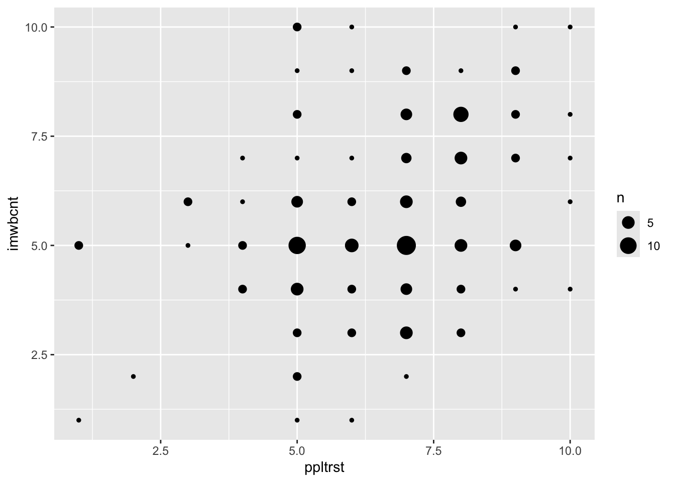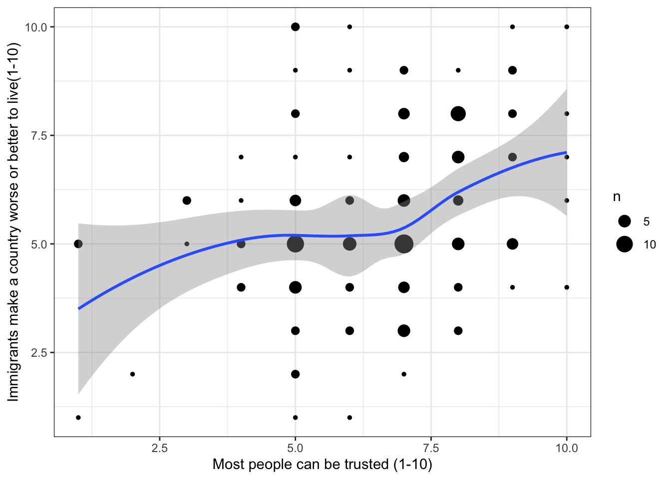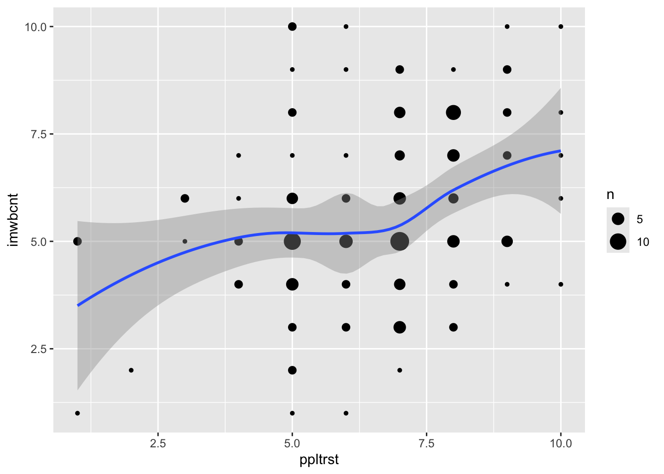 The geom_count() function in ggplot2 addresses this by adding up all duplicate values and then visualizing the number (“count”) of all observations with same values in the form of differently sized circles. A LOESS curve can then be added to show the overall pattern without assuming a linear relationship. This technique is especially useful for quasi-continuous variables, such as political trust, happiness, or attitudes toward immigrants in the ESS.