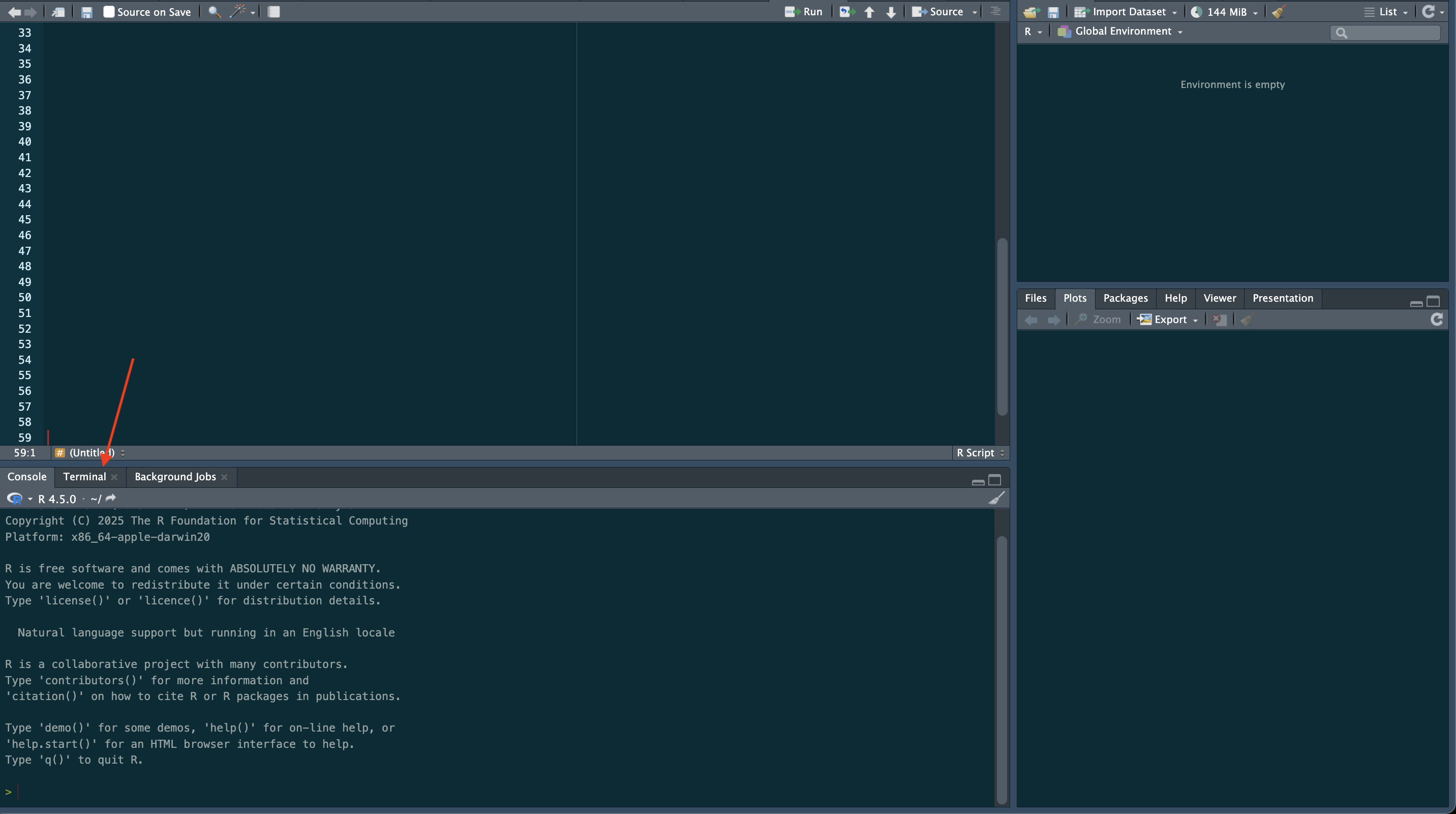 if you open the Terminal tab on the bottom (next to the Console tab; see Figure 1 below). When you do that, you should see another blinking cursor waiting for commands to execute. This works just like R