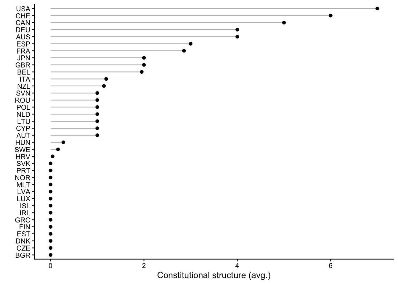 y = "")Figure 1 shows the results. On the left side, you see that countries differ in the “rigidity” of their political institutions. The United States and Switzerland stand out as countries with very rigid constitutions, where introducing reforms is very difficult, and this corresponds to what we know from more qualitative observations (Obinger 2002; Obama 2016). On the other end are a number of countries in different parts of Europe but also Israel, where there are few constraints. This does obviously not mean that these countries are dictatorships. It just means that there are few formal constraints on what a governing majority in parliament can do in day-to-day policymaking.