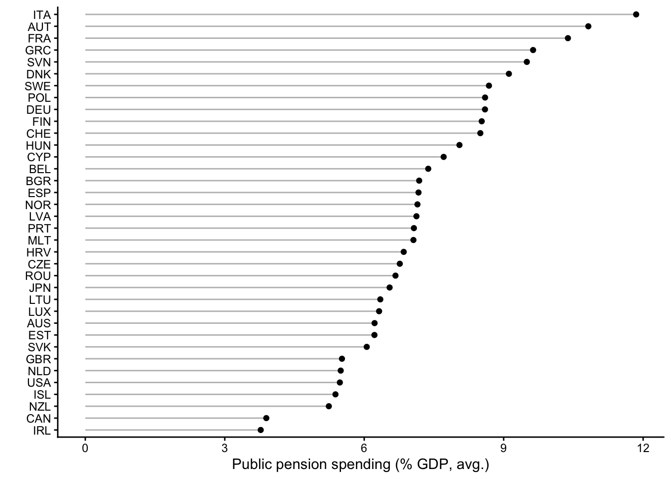 The other graph on the right shows that countries also differ quite a bit in how much they spend, on average, on old-age pensions. Conservative and southern European countries top the list, while more market-liberal countries like the United States, Canada, or Ireland are at the bottom.