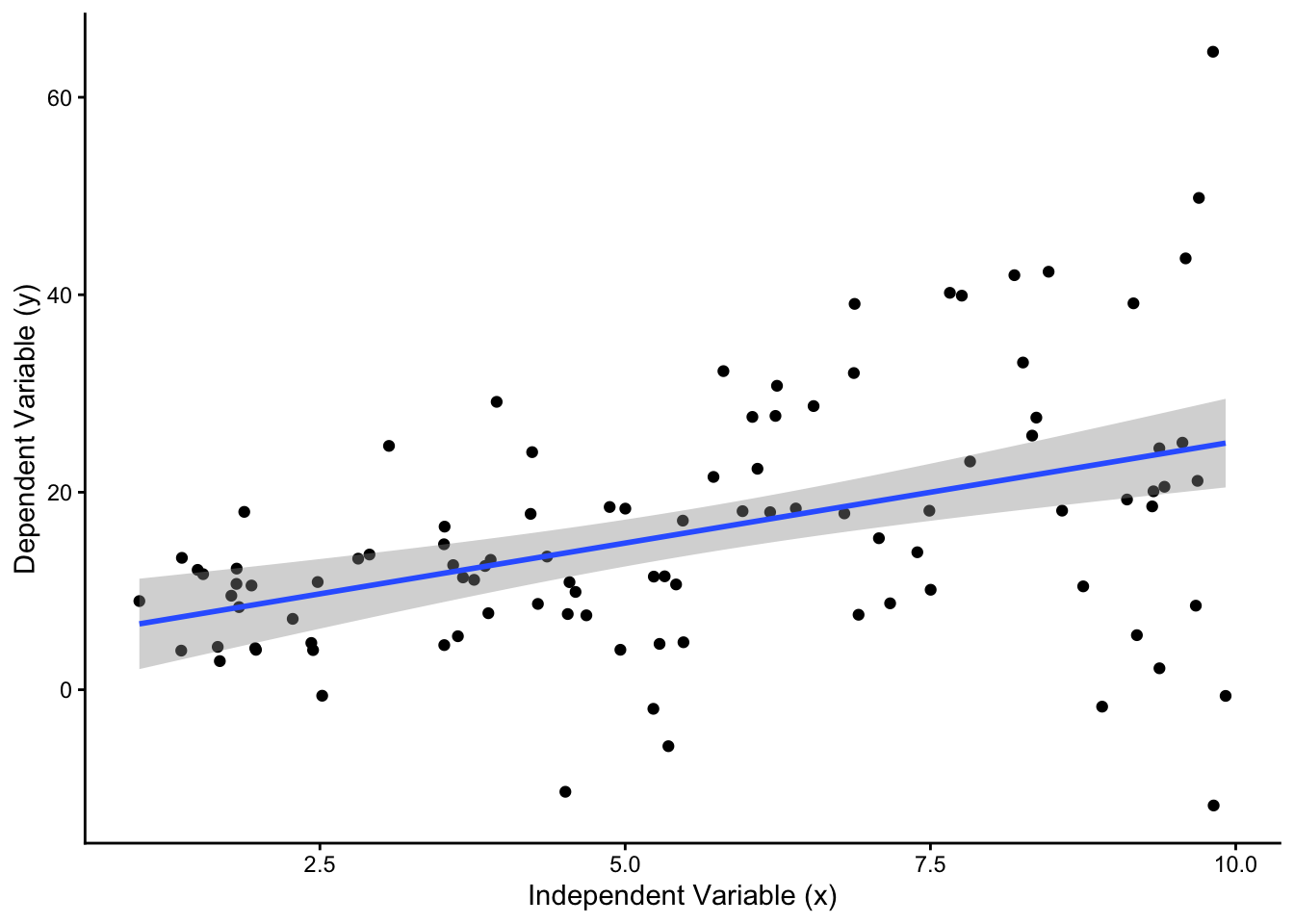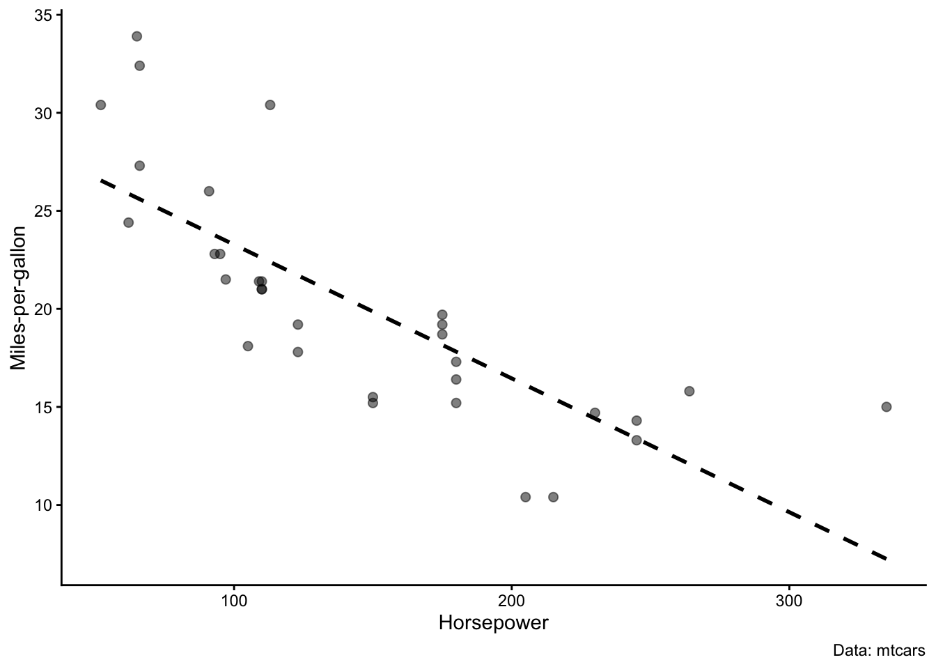 A normal regression model basically just draws a line through the data. The graph on the left in Figure 3 illustrates this with data from the mtcars dataset, where each observation is a car and cars differ in the strength of their engines (measured in horsepower) and in their fuel efficiency (measured in miles-per-gallon). Unsurprisingly, a more powerful engine with more horsepower means less fuel efficiency. In this case, the simple regression model works because the data are purely cross-sectional – there is no time-dimension or other complication.