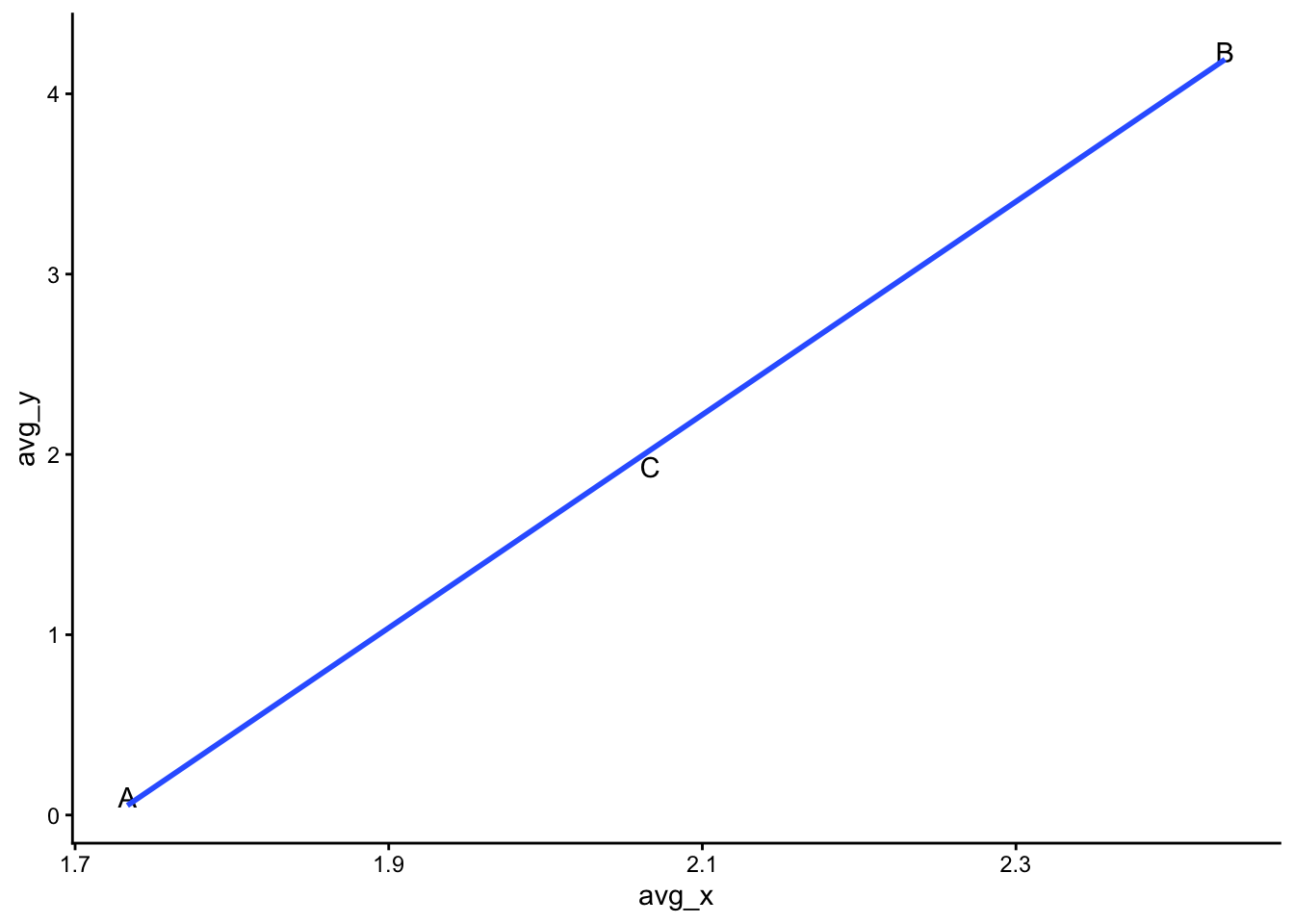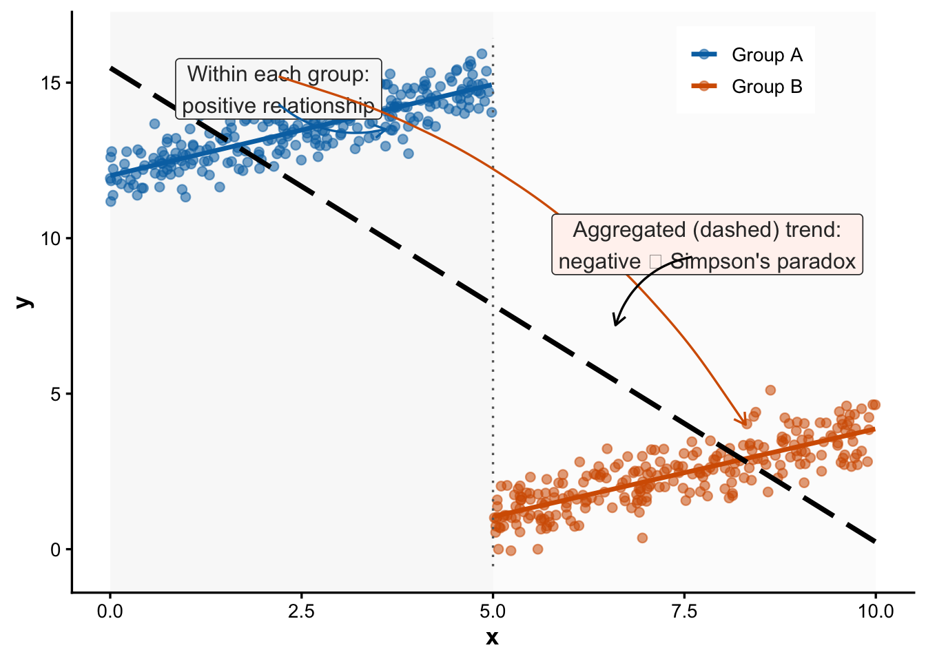 When we visualize the patterns in the data (see Figure 4), we see that this is a textbook case of Simpson’s Paradox: Within each group, there is a negative relationship between x and y over time (time points are indicated as numbers). A naive OLS model, however, would find a positive relationship.