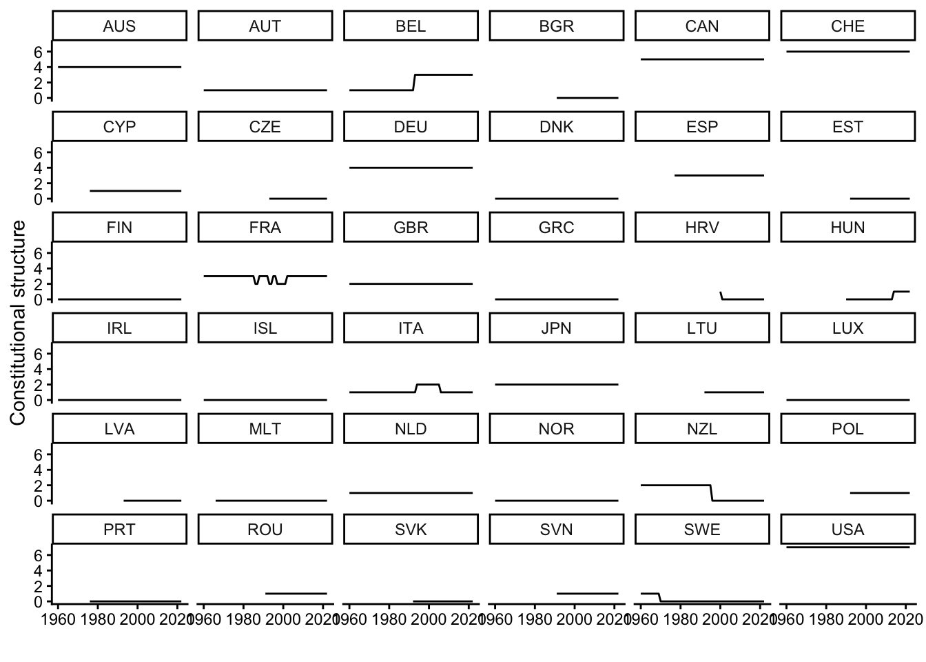 When you now look at the graph showing countries’ constitutional rigidity, you see that there are barely any changes over time. France is the big exception here since it introduced several constitutional changes over a decade or so, and there have also been changes in Belgium, Croatia, Hungary, Italy, New Zealand, and Sweden – but, overall, there is mainly stability.