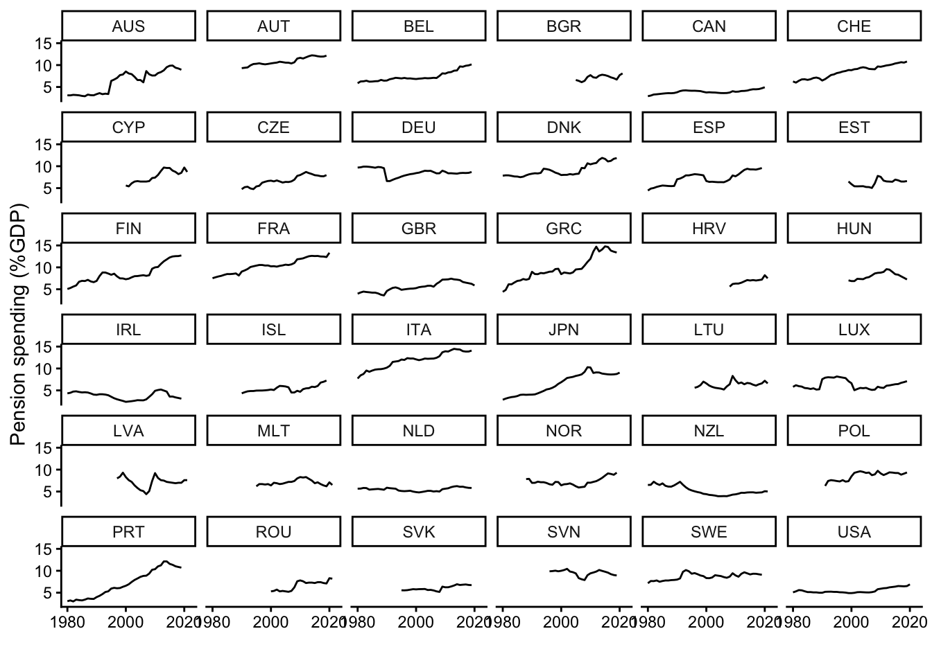 This contrasts with the pattern in the other graph that shows the development of public pension spending in each country. Many countries experienced significant increases over time (e.g., Greece, Portugal, Italy, Japan, Finland, France, or Switzerland), while spending stayed more constant in other countries (e.g., Poland, Germany, or the Netherlands). In all cases, however, there are small year-to-year changes, which is a clear difference to the completely flat lines in the graph above.